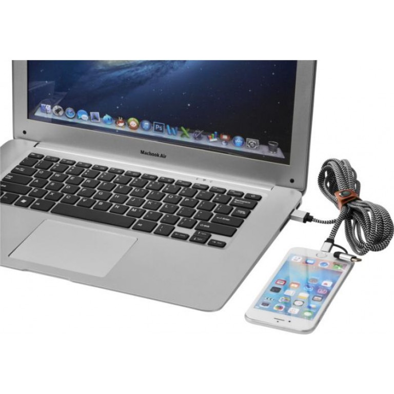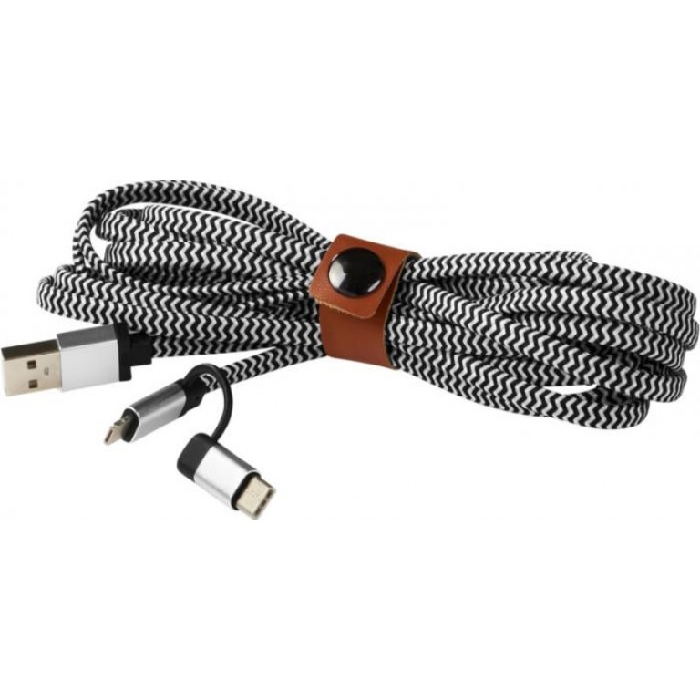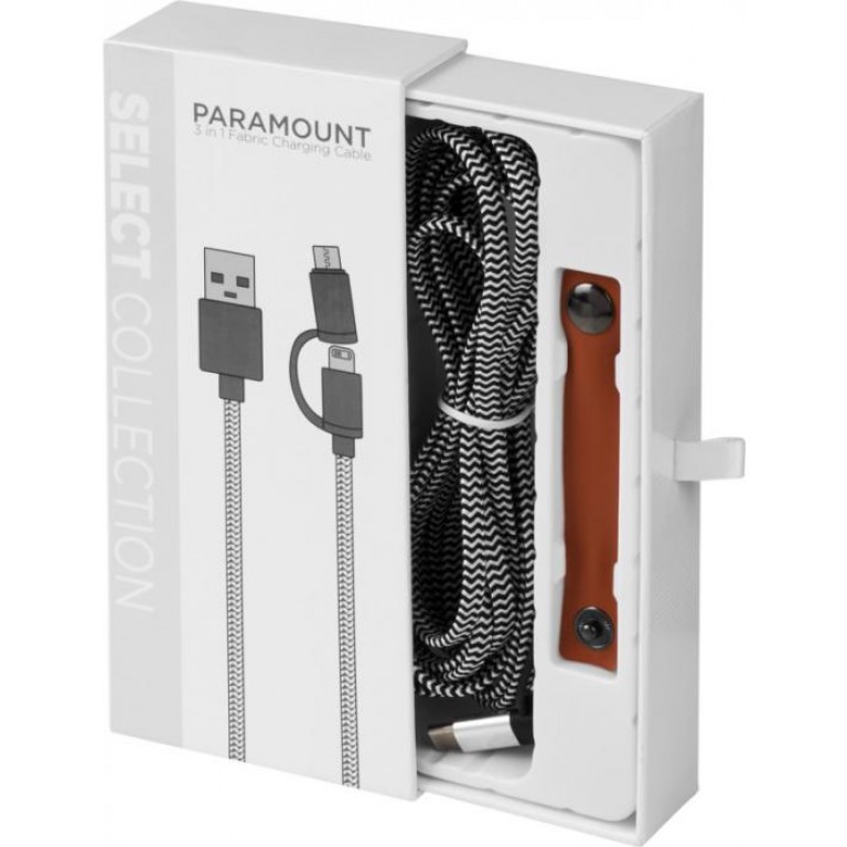 The Paramount 3-in-1 fabric charging cable includes a USB type-C tip and a 2-in-1 dual compatible tip for both Apple iOS and Android devices. The cable is 280 cm long with a PU strap to wrap the cable. Supports 2A current and data transfer. Packed in a premium gift box. Fabric.