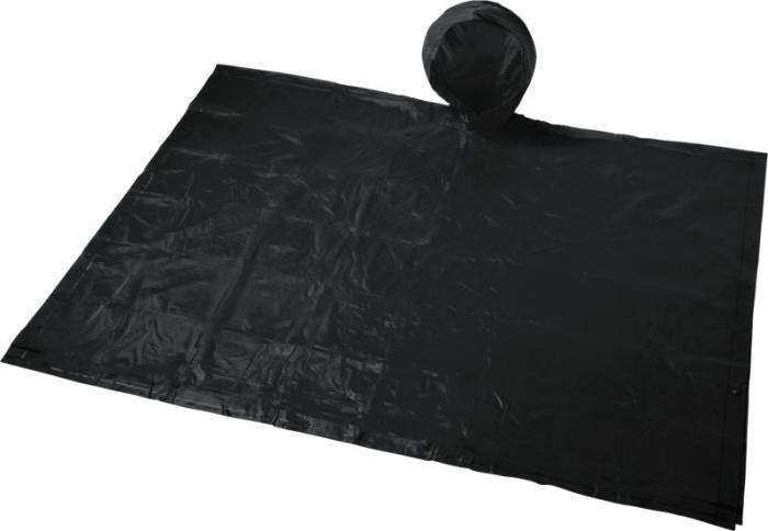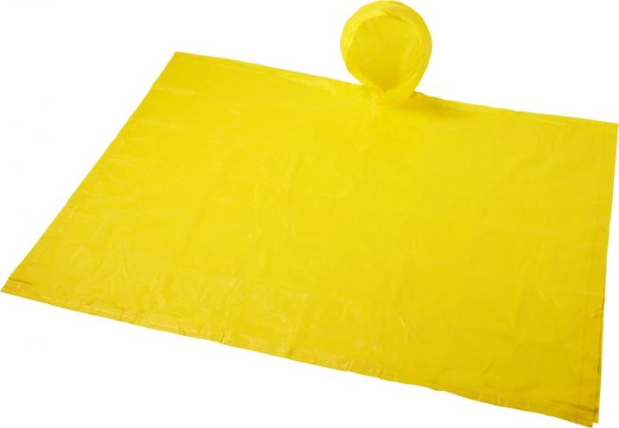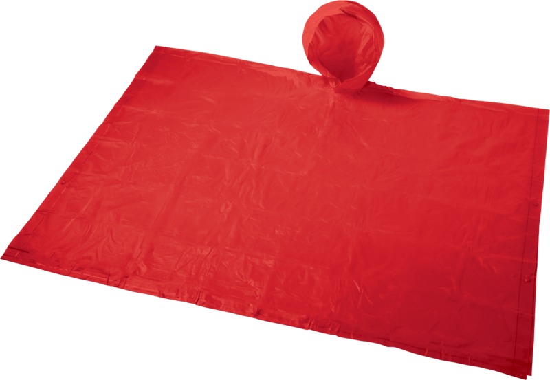 A foldable poncho with hood for unexpected rain showers during any outdoor activity. The reusable poncho is 100×130 cm large, and has button closures on each side. Comes in a wide variety of colours with a large decoration area on the pouch. PVC.