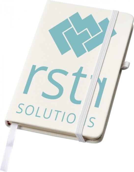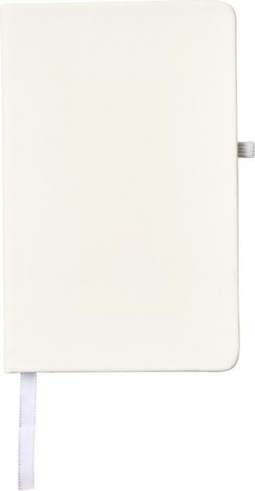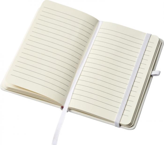 A6 reference size notebook with a white elastic closure, pen loop, and ribbon. Includes 96 sheets of 70g/m2 lined paper. Soft feel PU cover. Paper, PU Plastic.