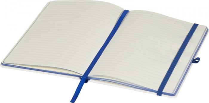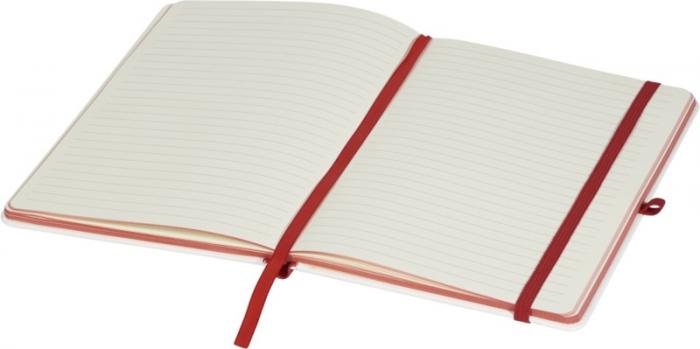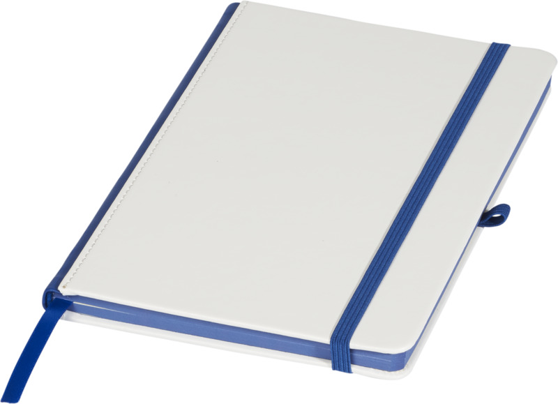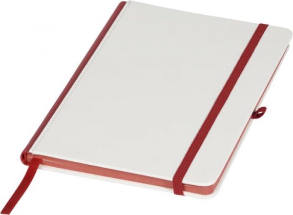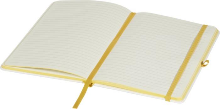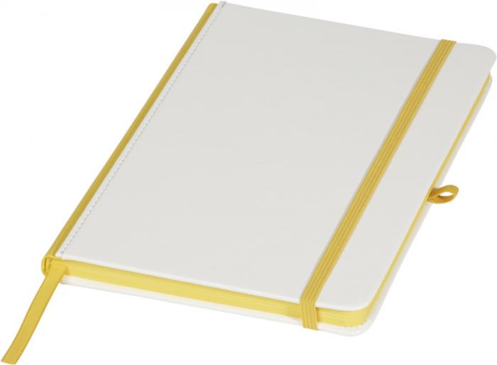 A5 size hard cover notebook, revealing your logo or brand in blue, red, green or yellow after laser engraving. With matching coloured ribbon marker, elastic closure and elastic pen loop. Also features an expandable pocket at the back to keep small notes. Available in the following colours: Black/Lime, Black/ Blue, Black/Red, Black/Grey, Black/Yellow. 80gsm, 80 sheets of cream colour lined paper. Packed in a sleeve. Thermo PU Plastic.