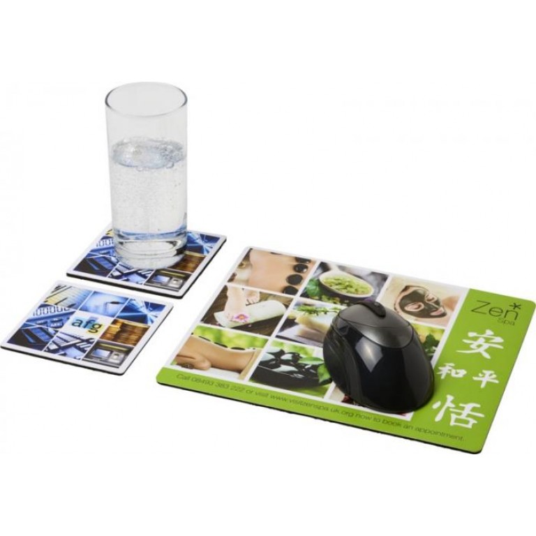 Features a Q-Mat mouse mat and a set of two matching coasters branded with your company design. The set comprises of a rectangular mousemat (0.3 x 23.5 x 20 cm) and two square coasters (0.3 x 9.8 x 9.8 cm). EVA Foam, Laminated paper.