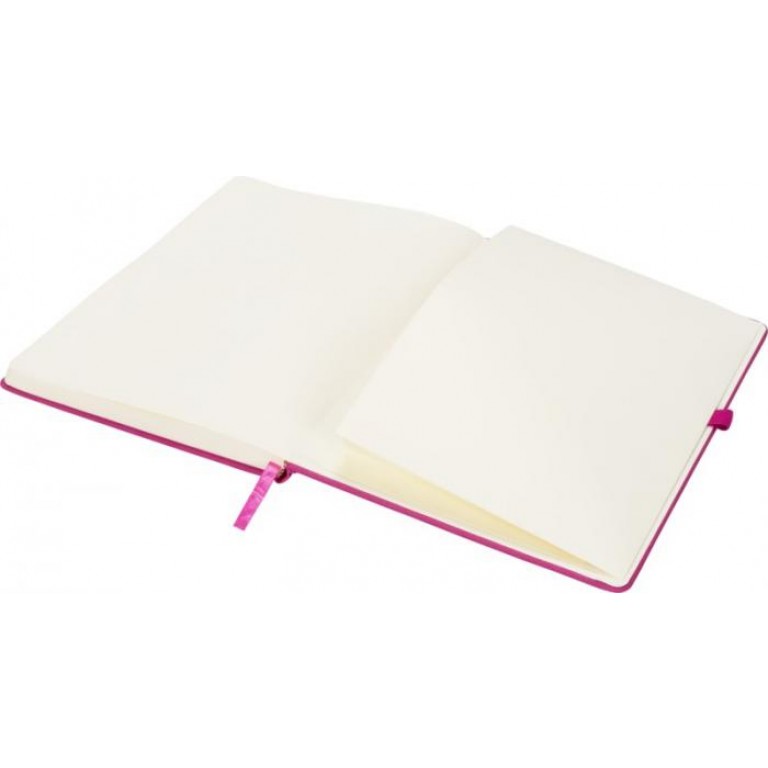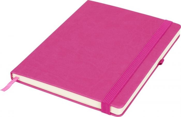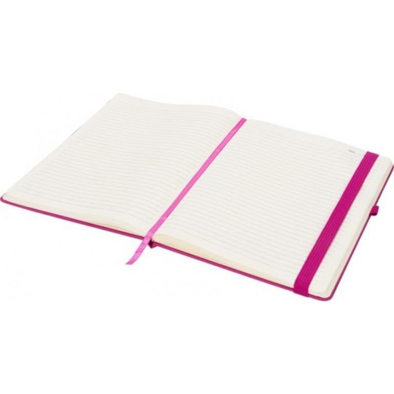 Soft touch cover notebook (A5 size reference) with built-in elastic closure, ribbon page marker, document pocket on interior back cover and 80 sheets (80gm) of lined paper. Thermo PU Plastic.
