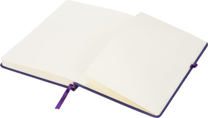 Leather-look (thermo PU) hardcover A5 notebook with stitches around the edges and a round spine, delivered in a Luxe sleeve. Specifications: 70 g/m2 paper, 80 sheets cream paper, lined format, back pocket, elastic closure, ribbon marker, and a pen loop. Cowhide thermo PU Plastic.
