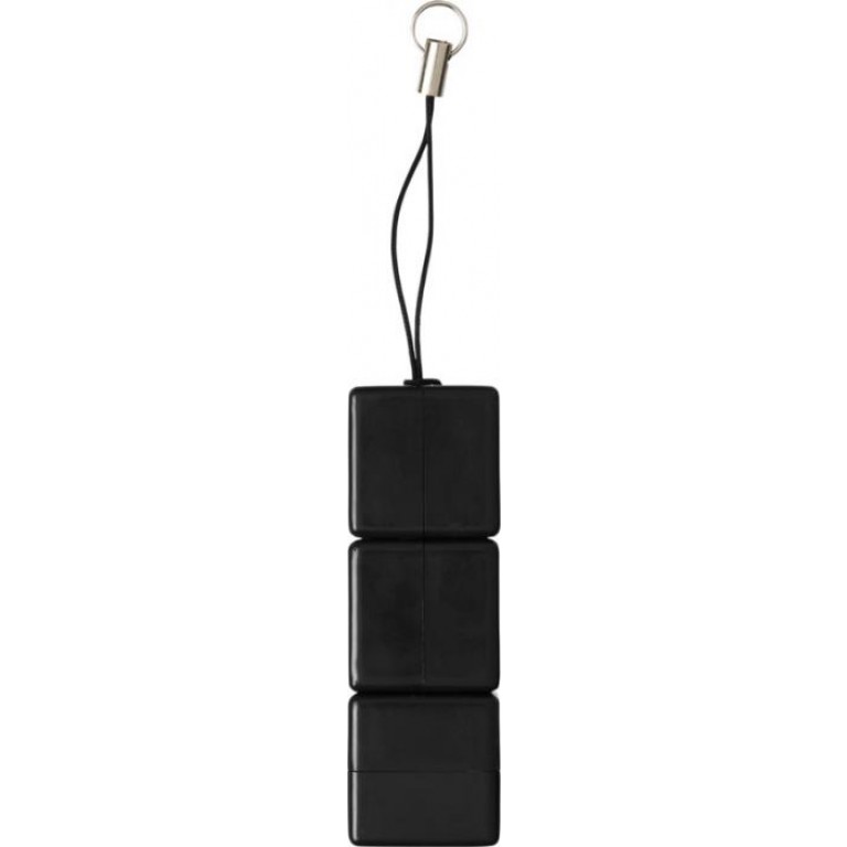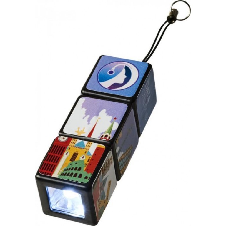 Rubik’s® LED keychain light. Rotate the blocks to turn the light on and off. Supplied on a key loop with button cell battery included. ABS Plastic.