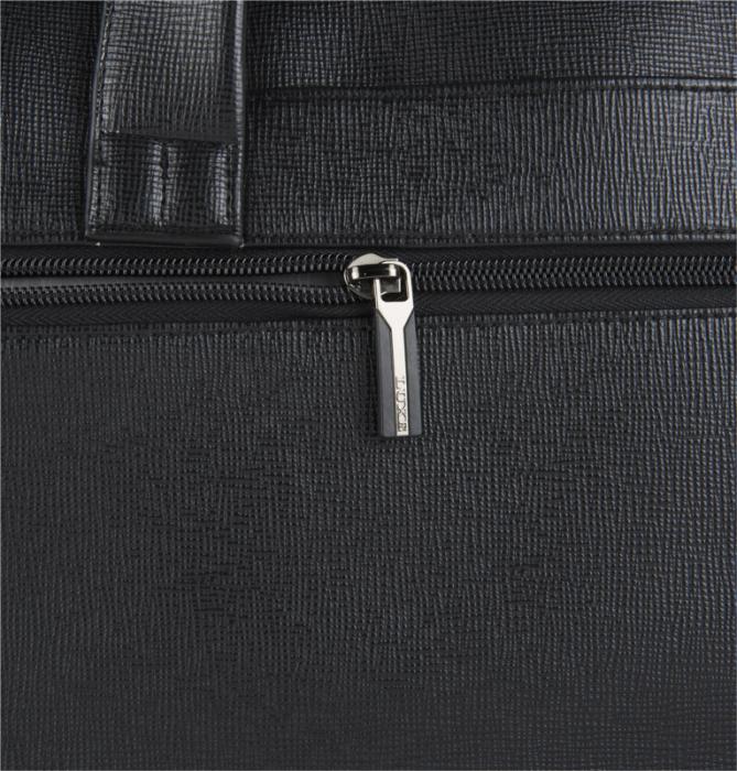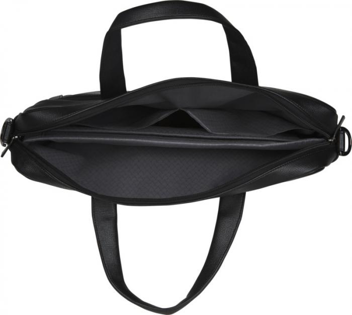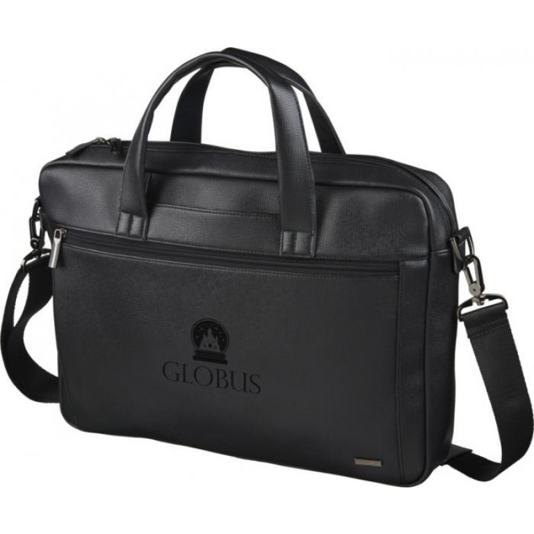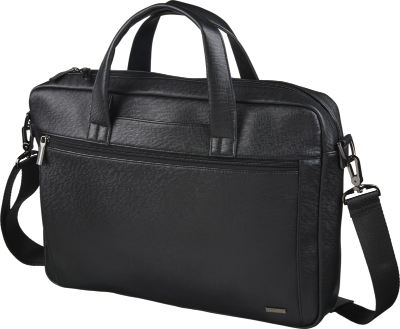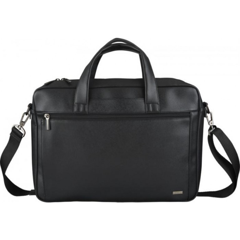 Exterior with textured vinyl gives a luxurious appearance. Small slash pocket between handles and Large zippered pocket with organization panel inside on front side. Zippered main compartment with 2 big slash pockets, padded 15” laptop- and tablet compartment. Trolley sleeve on the back. Nylon webbed adjustable, removable and padded shoulder strap. Sleek and subtle Luxe branding. Vinyl.