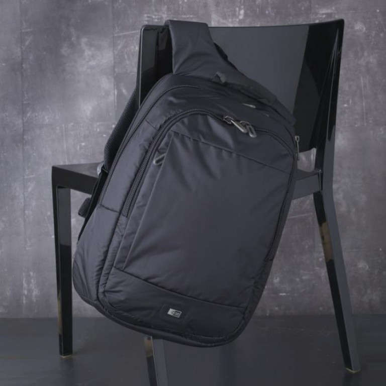 Exclusive design laptop backpack with dedicated laptop compartment disappears underneath straps to protect laptops with up to a 15.6” display. Padded, nylex-lined iPad pocket prevents scratches to your iPad or 10” tablet screen. Front compartment features storage pockets for small electronics and a zippered pocket and additional space for a power brick. Front exterior slip pocket allows quick access to a boarding pass or other transportation ticket. Padded, mesh back panel and shoulder straps. 210D of Nylon.