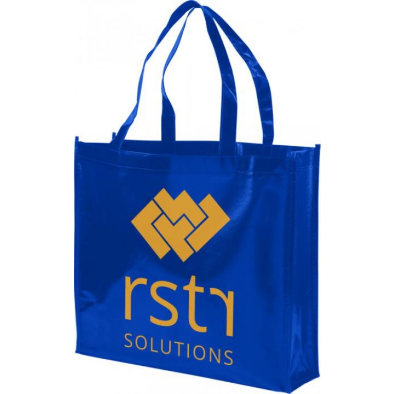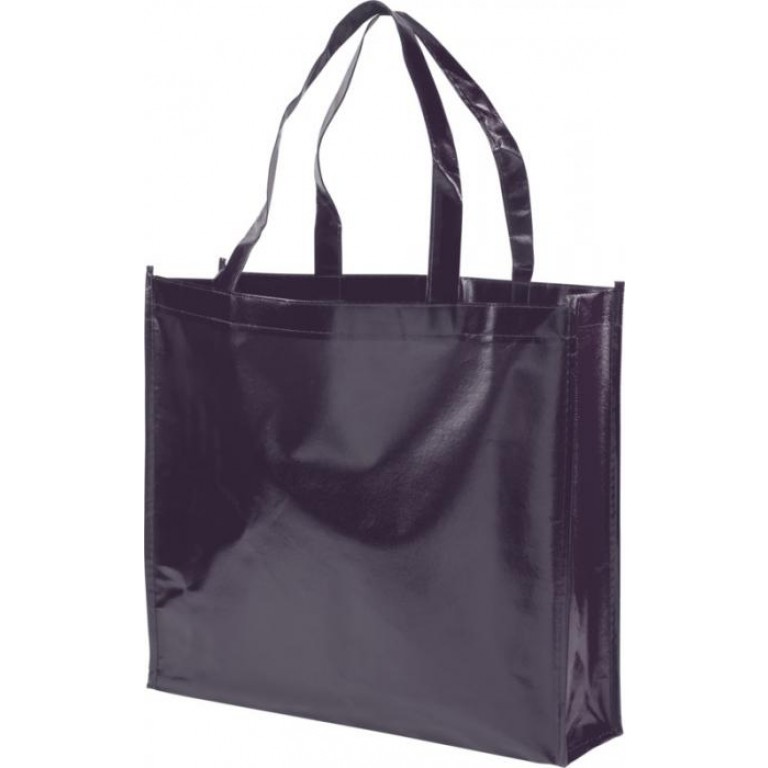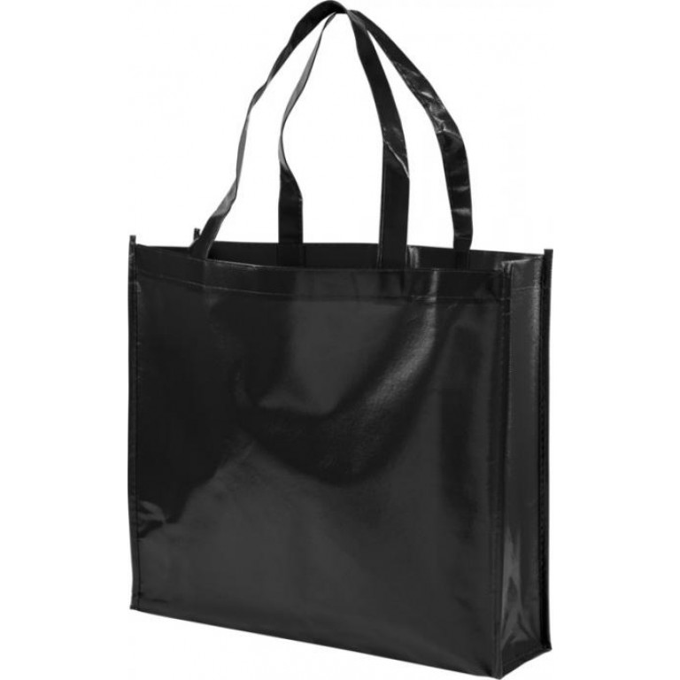 Shiny laminated non-woven shopping tote bag. A convenient laminated non-woven shopping tote bag with a dropdown handle length of 23 cm. 80 g/m² Laminated non-woven PP Plastic.