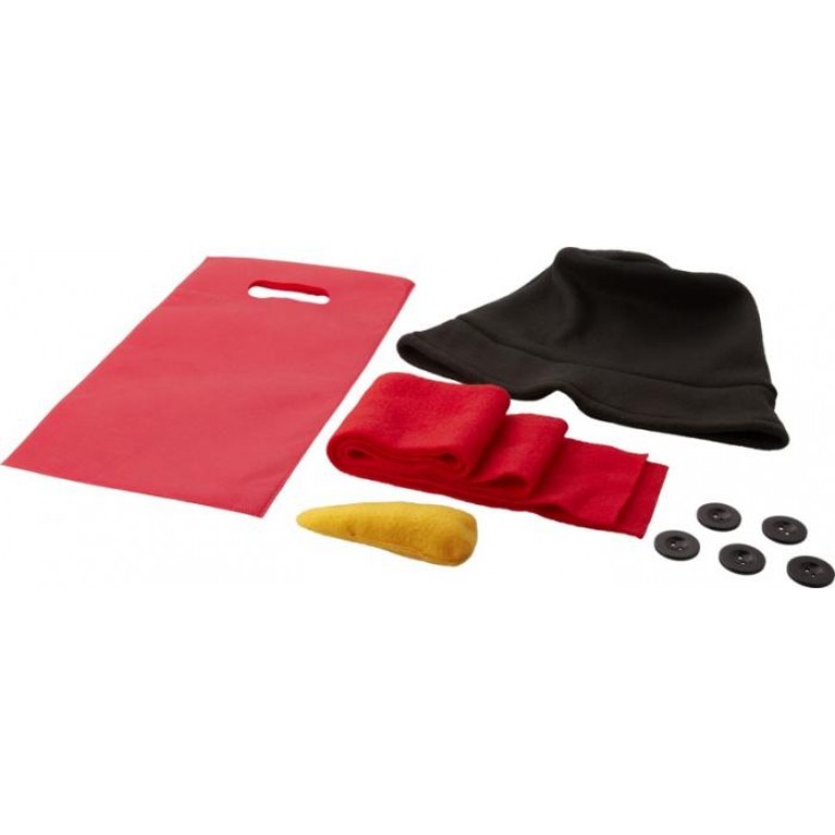 Dress up a snowman with this accessory set consisting of a hat, scarf, carrot nose and 5 buttons all packed together in a bag. 25% Non-woven polypropylene and 25% UPR and 25% Polar fleece and 25% Polyester.