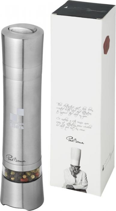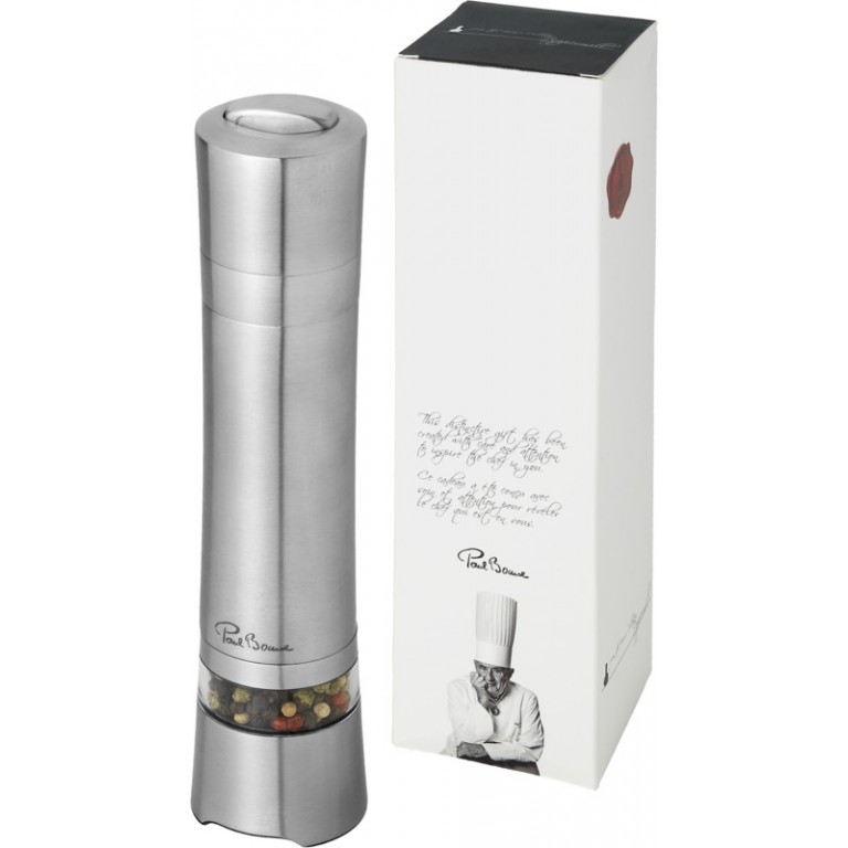 Automatic pepper mill with ceramic grinder. Peppercorn and batteries are not included. Pepper mill operates on 6 pieces of AAA batteries. Presented in a Paul Bocuse gift box. Exclusive design. Stainless Steel.