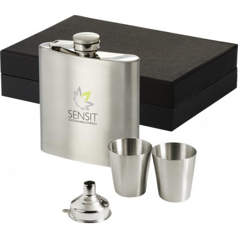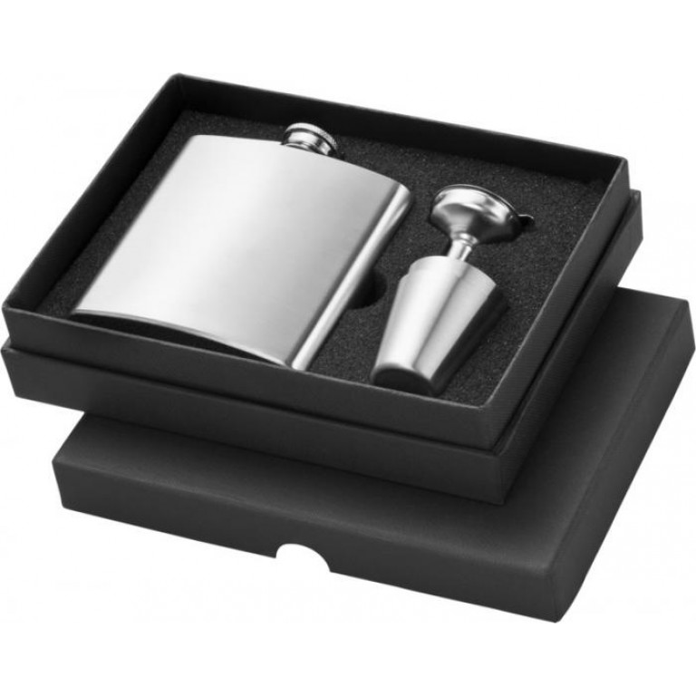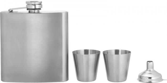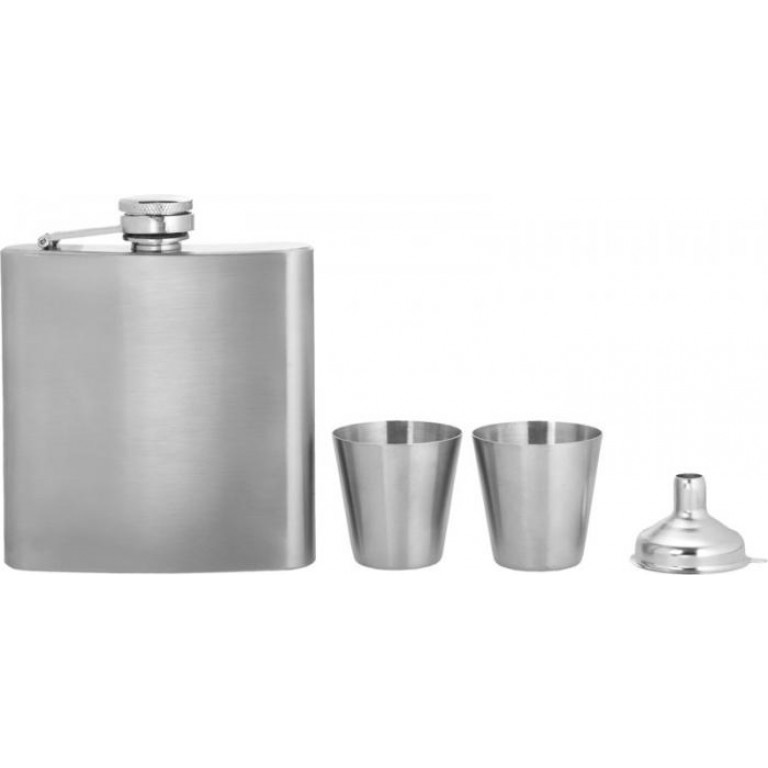 Single wall flask with twist-on lid. Volume capacity is 175ml. Together with 2 shot tumblers and a funnel the set is presented in a gift box. Stainless Steel.