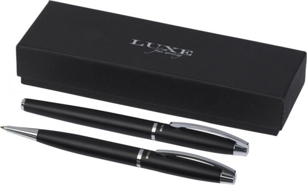 Duo pen gift set consisting of a twist mechanism ballpoint pen and a cap type rollerball pen. Including a premium black refill. Packed in a ”LUXE” gift box. Metal.