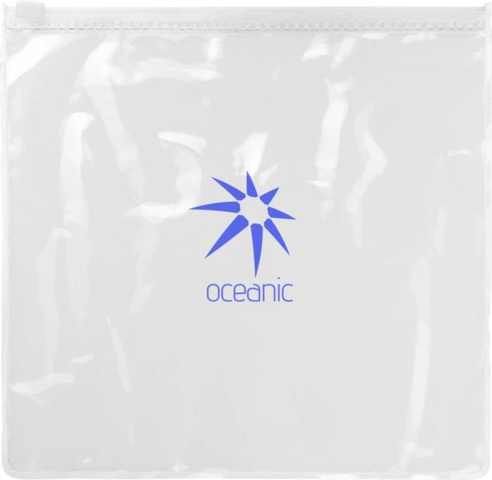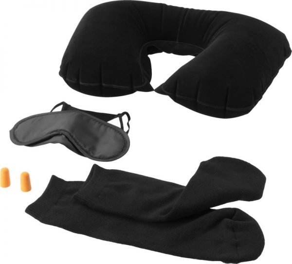 Travel set with eye-mask, earplugs, neck pillow and travel socks, packet in a transparent pouch. Decoration not available on components, only on pouch. PVC.