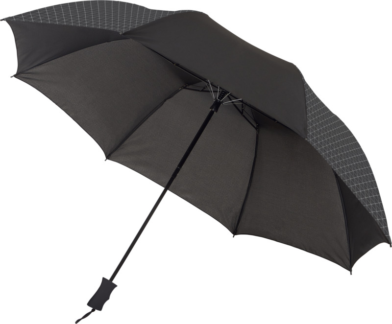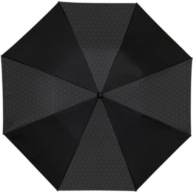 Automatic opening 23” foldable two-section umbrella. Pongee polyester canopy with geometric design. Metal shaft with fibreglass ribs, rubberized handle with wrist strap. Including storage pouch. Polyester.