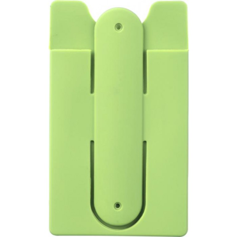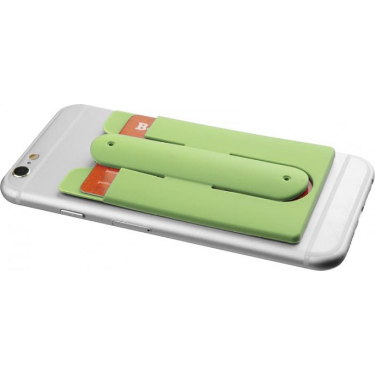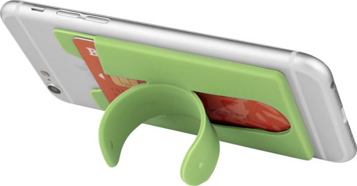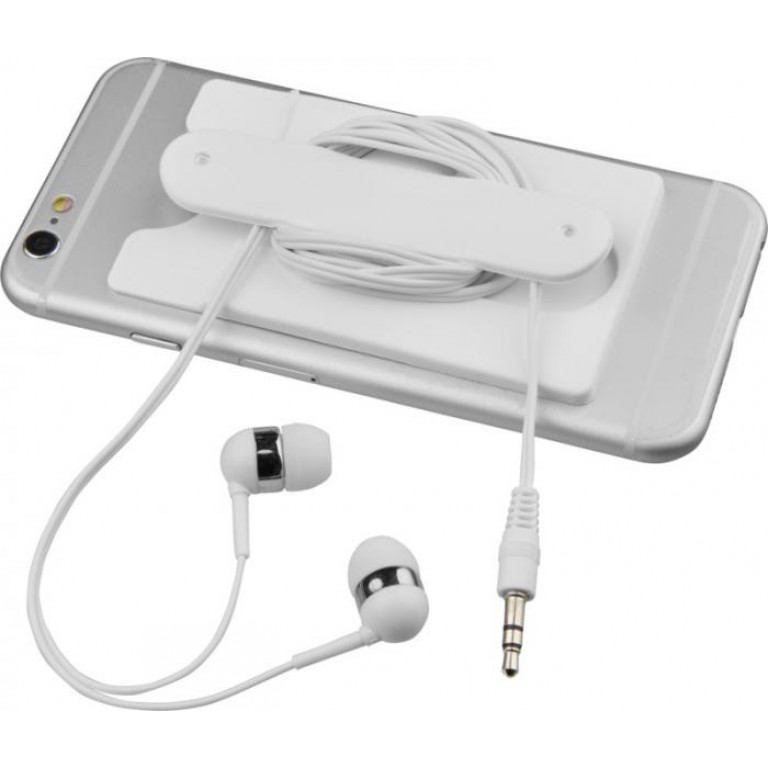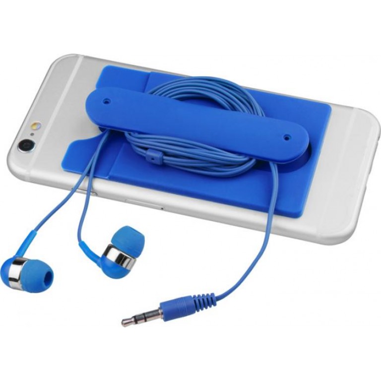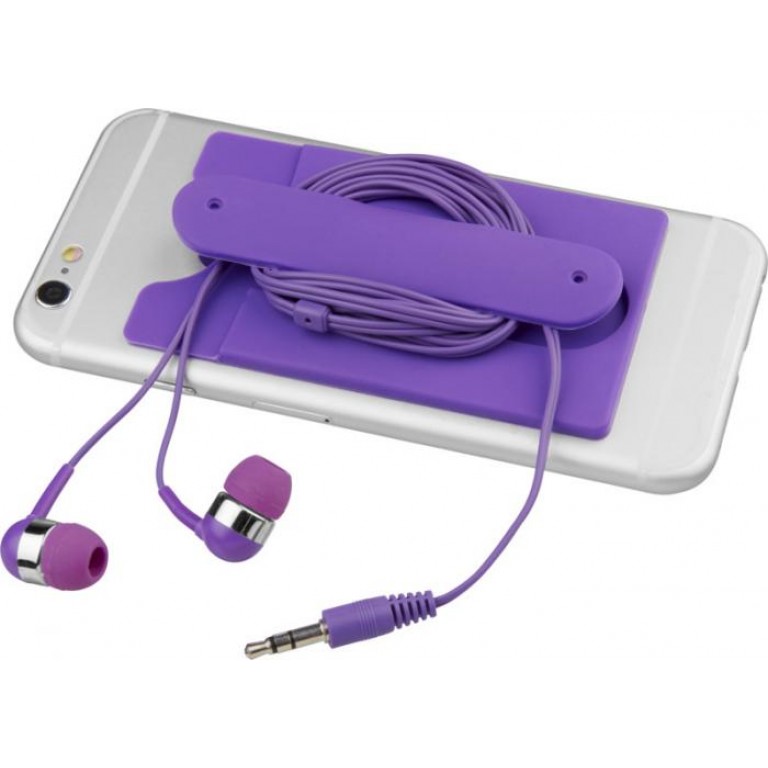 A soft protective silicone wallet with adhesive tape that can be easily attached to the back of a phone to hold 2-3 credit cards and/or ID cards. It can also be used as a phone stand or as earbuds wrap. Includes wired earbuds. Silicone Plastic.