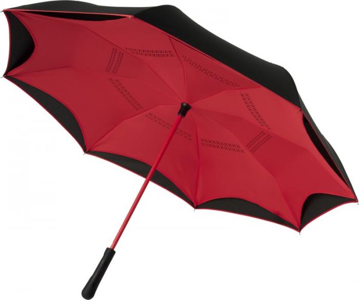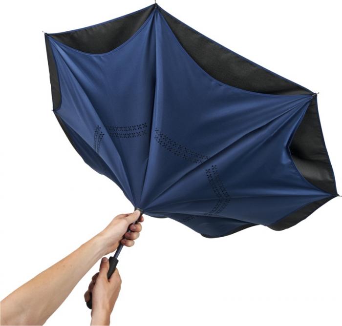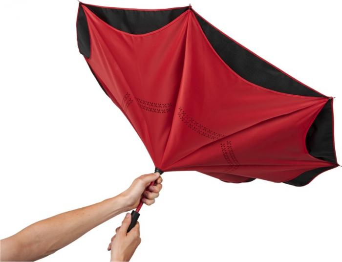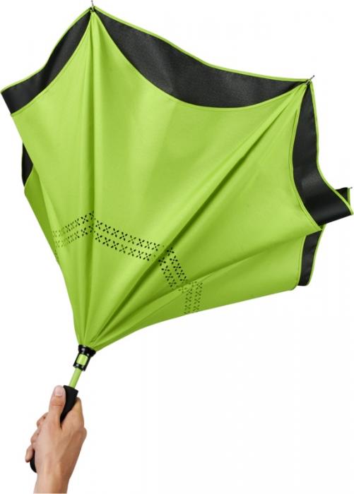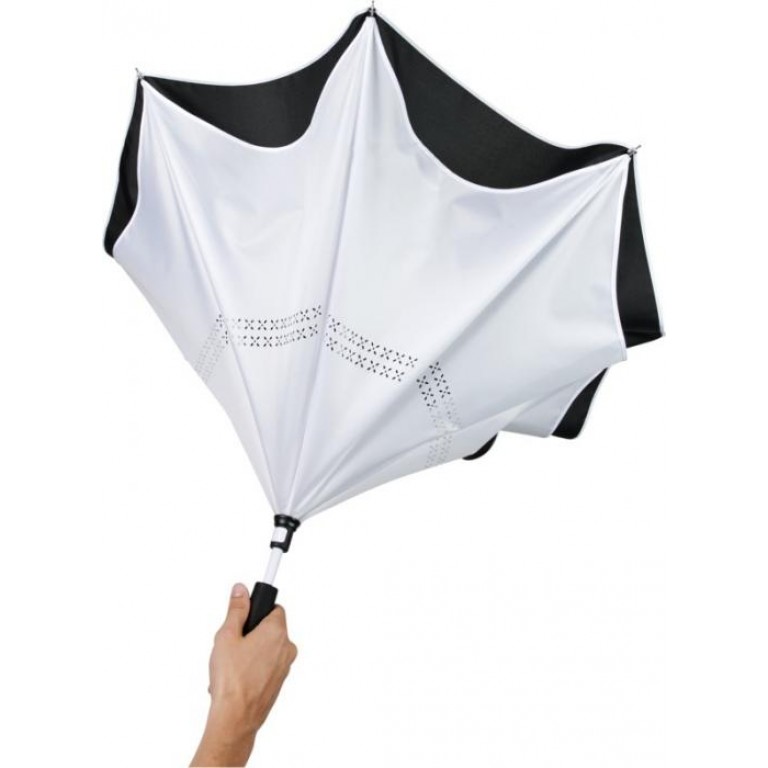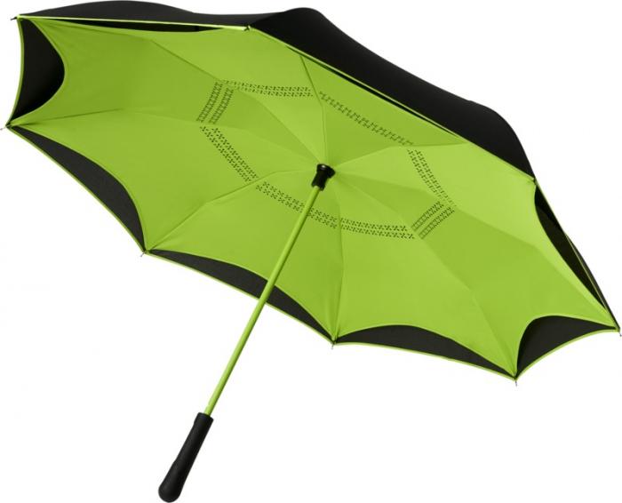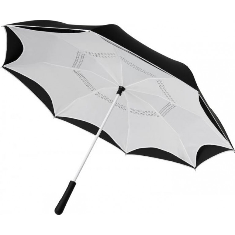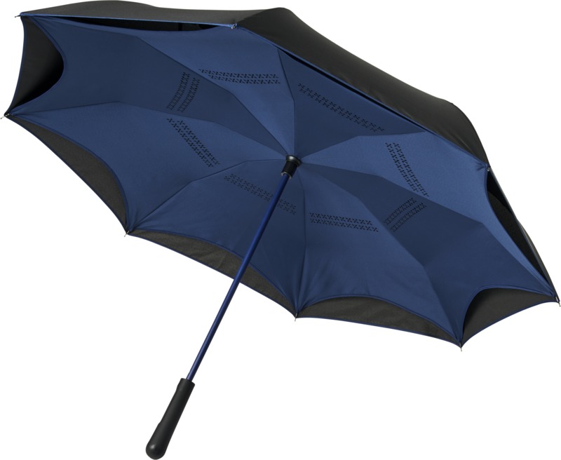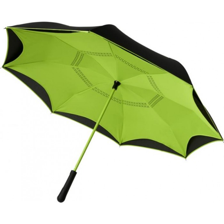 23″ Innovative design reverse folding umbrella in fresh colours. Opens and closes “inside-out” making it easier to use when getting in and out of a car by keeping the water contained and outer surfaces dry. The umbrella stands on its own when closed allowing the water to drain out to dry. Windproof frame with fibreglass ribs and shaft. Automatic opening with a push button pinch-proof runner and double layer pongee polyester canopy. The inner canopy and the piping on the outside canopy are matching colours with both the fiberglass shaft and push button. Large decoration area available on each of the panels. Pongee Polyester.